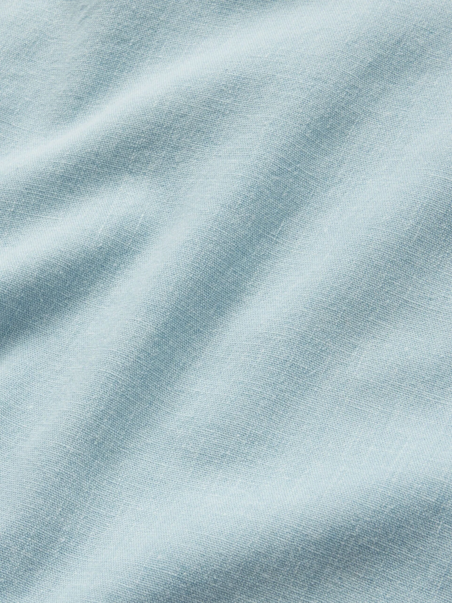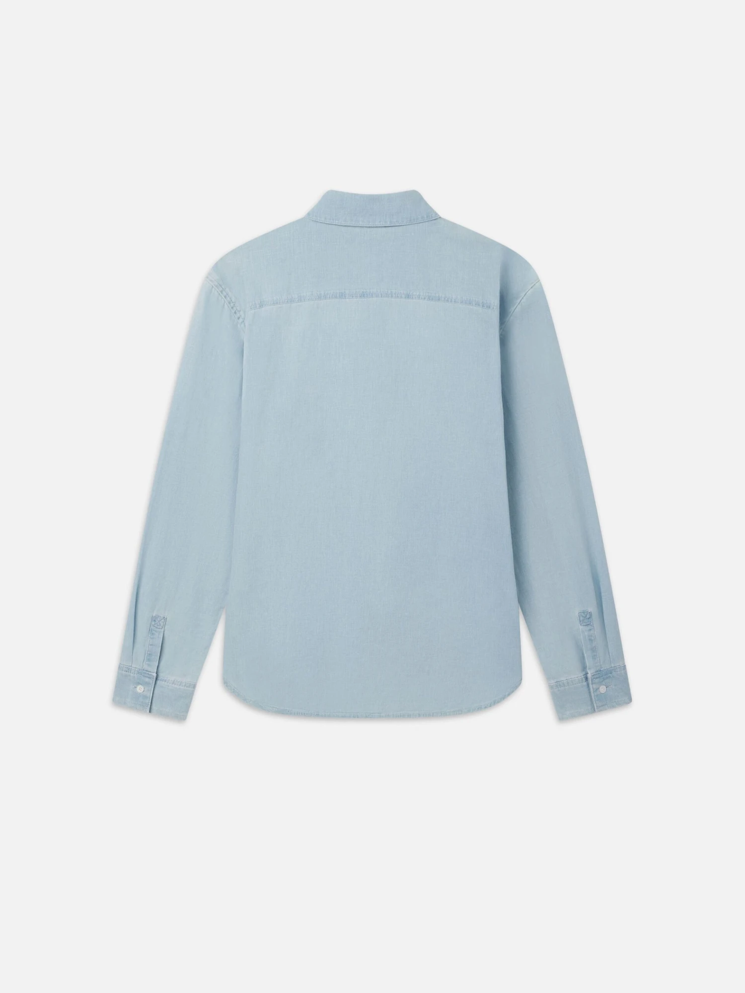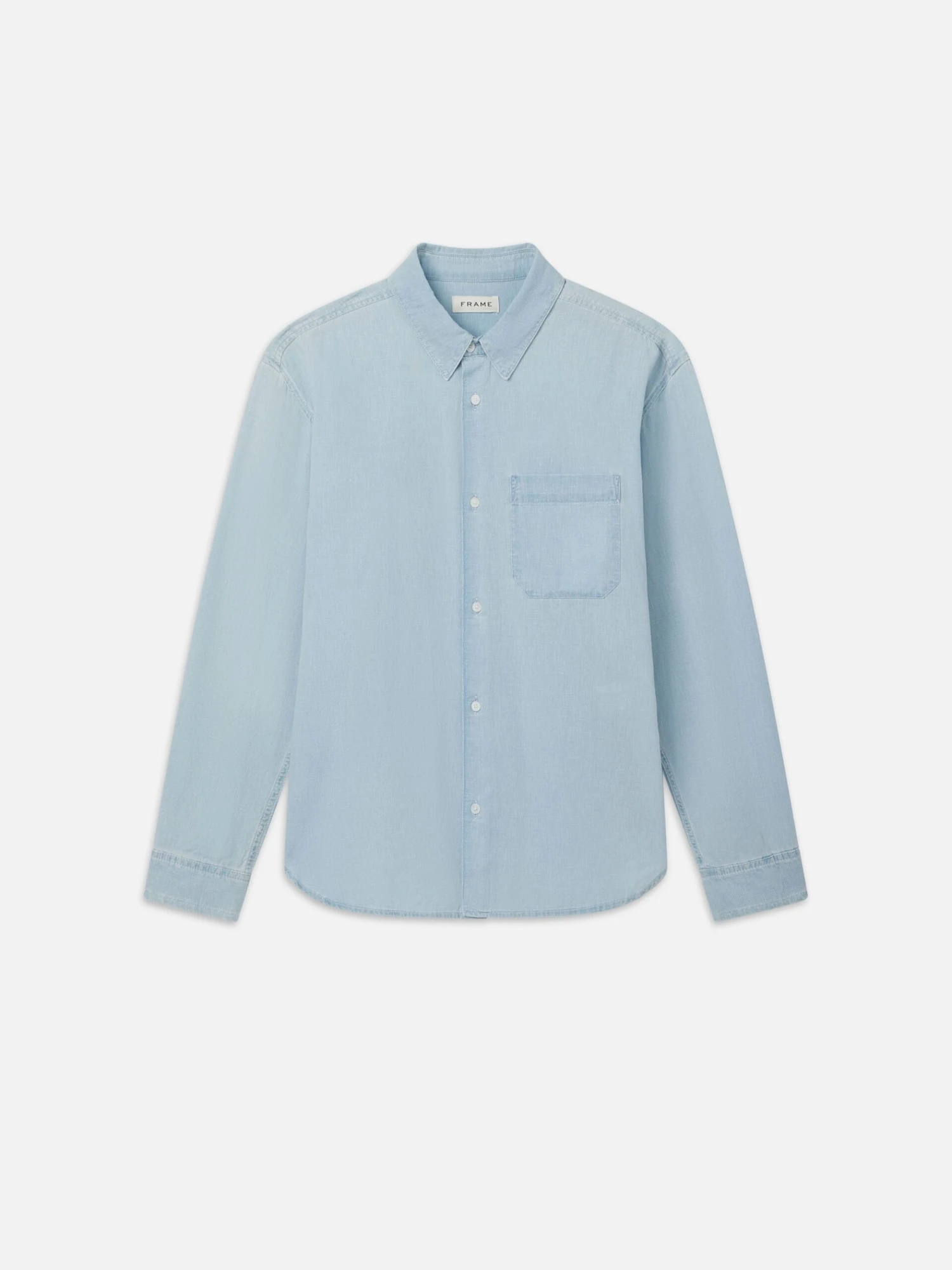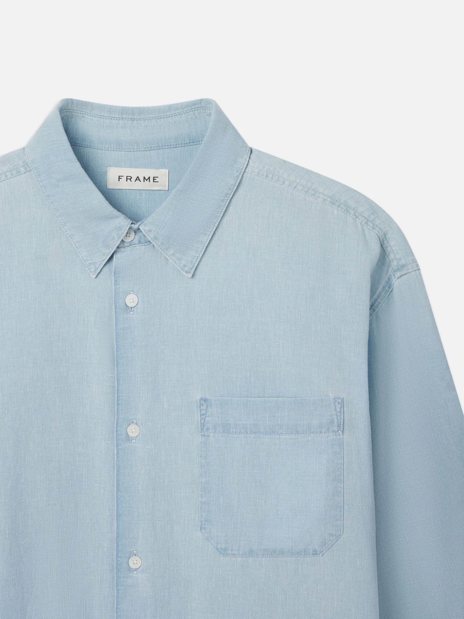 Half cotton, half linen, the everyday denim shirt gets an ultra breathable update. The design keeps it light with white summarys down the front and a faded blue wash that carries over the single pocket at the chest. An icy winter staple that transitions perfectly into spring.