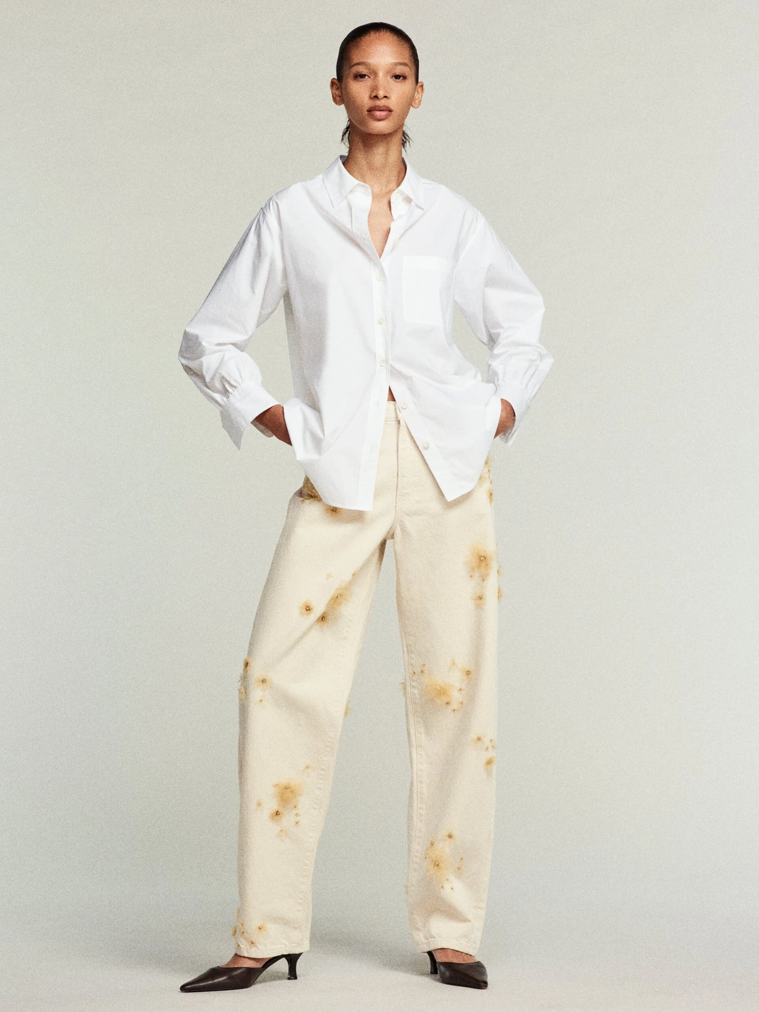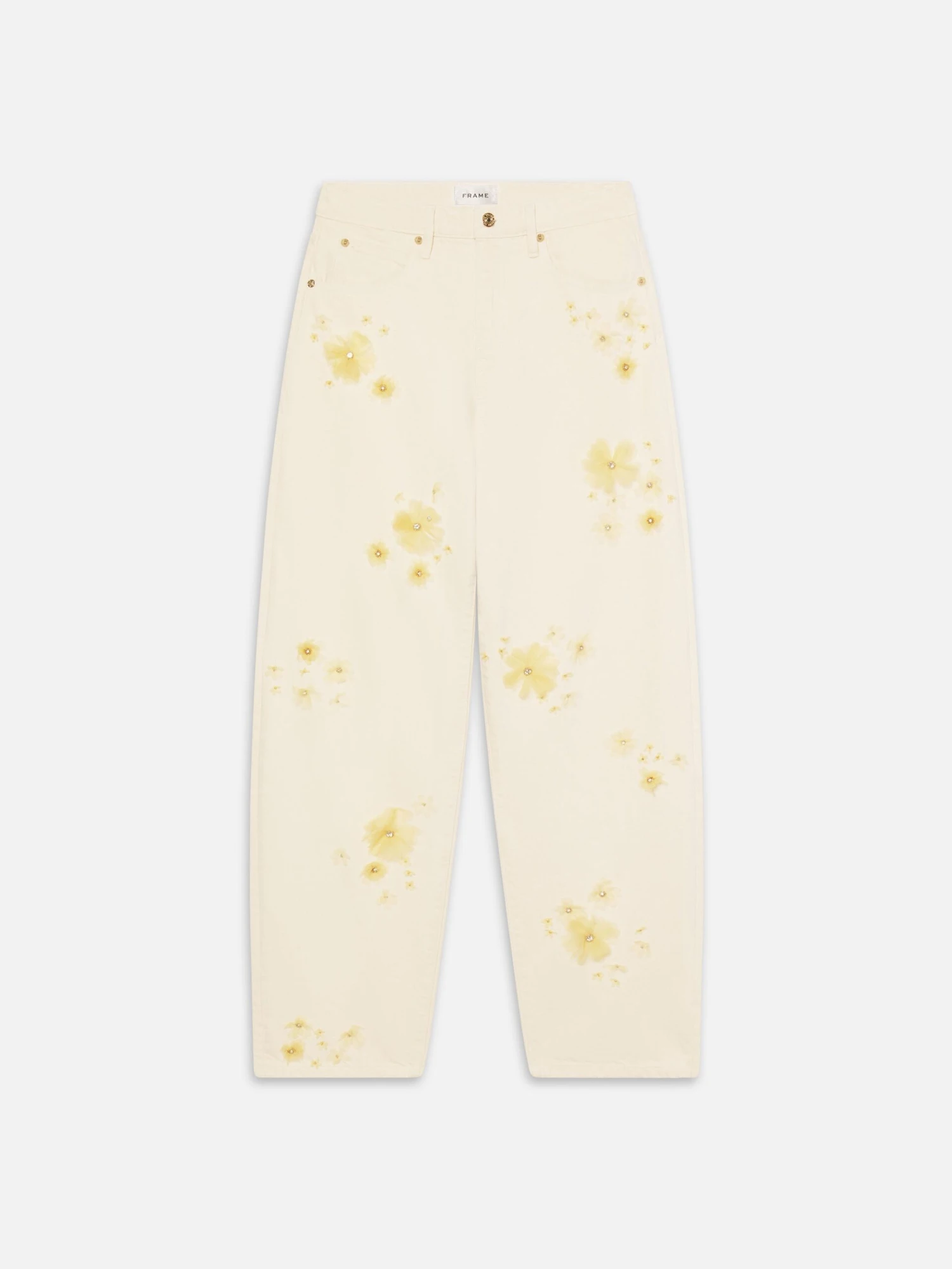 Our fresh take on a trending silhouette, this Low Slung Barrel is the new pair to add to your current rotation. It has a waist that sits right on the hips with a subtle taper at the leg and an inseam that rests on top of the foot. Crafted in cream, this flattering shape looks good with all of your closet essentials.