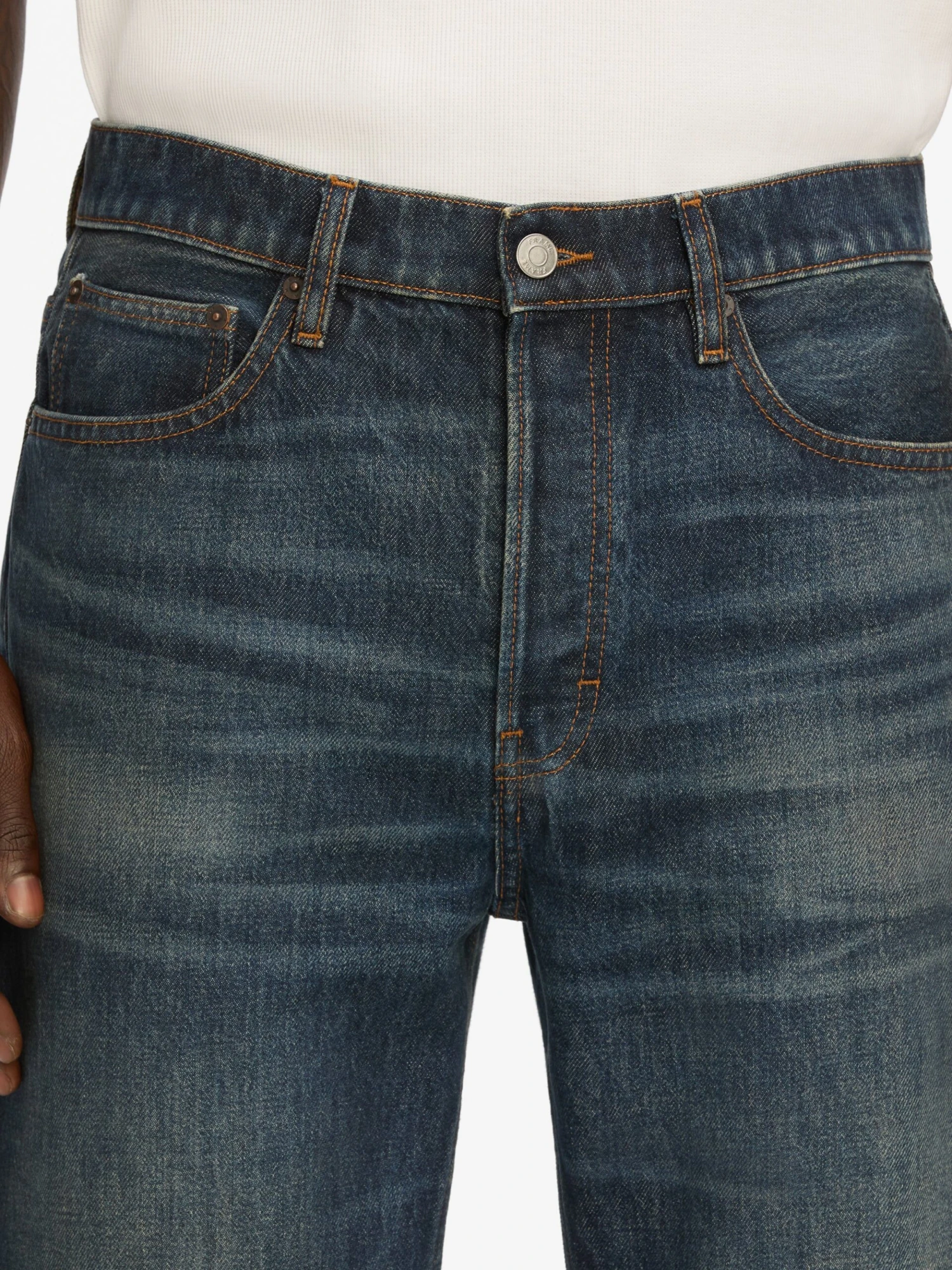 A classic reimagined with a modern edge. This mid-rise jean features a clean, flared silhouette and summary-fly closure, crafted from premium 100% cotton denim for a timeless, rigid feel that molds to your body over time. Finished in a versatile dark blue wash with subtle fading for a naturally worn-in look. Designed with a long inseam for a lengthened, tailored fit.