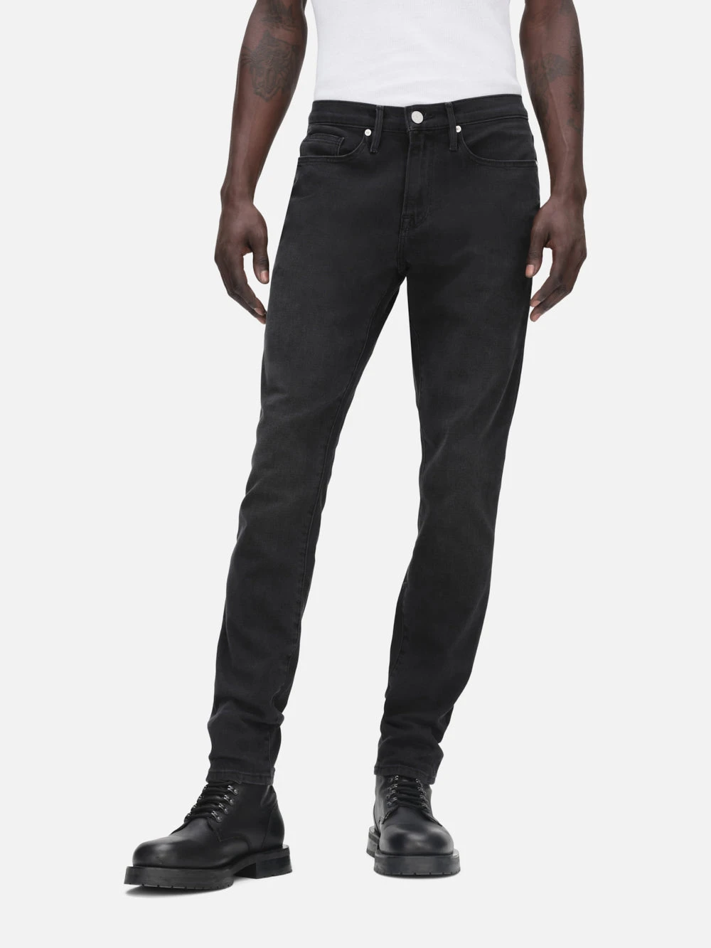 A skinny silhouette cut from premium denim with a dark grey wash. A 5-pocket pair, narrow through the hip and slim fit through the leg. Zip fly with a comfortable mid-rise waist.