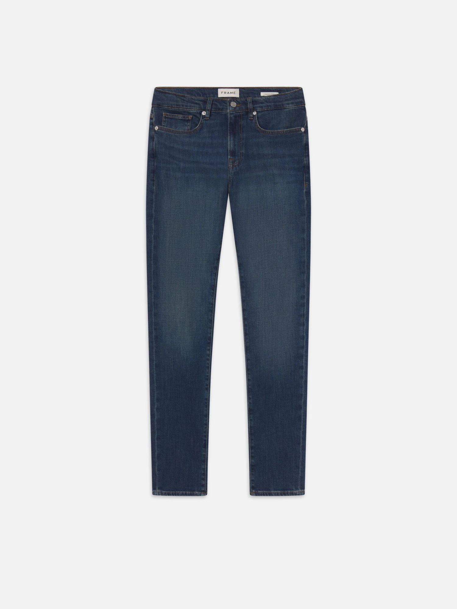 A FRAME signature jean, this style is designed with a classic 5-pocket construction, comfortable mid rise, flattering straight leg, and tapered slim fit at the leg opening. Crafted from smooth, comfort-stretch denim.