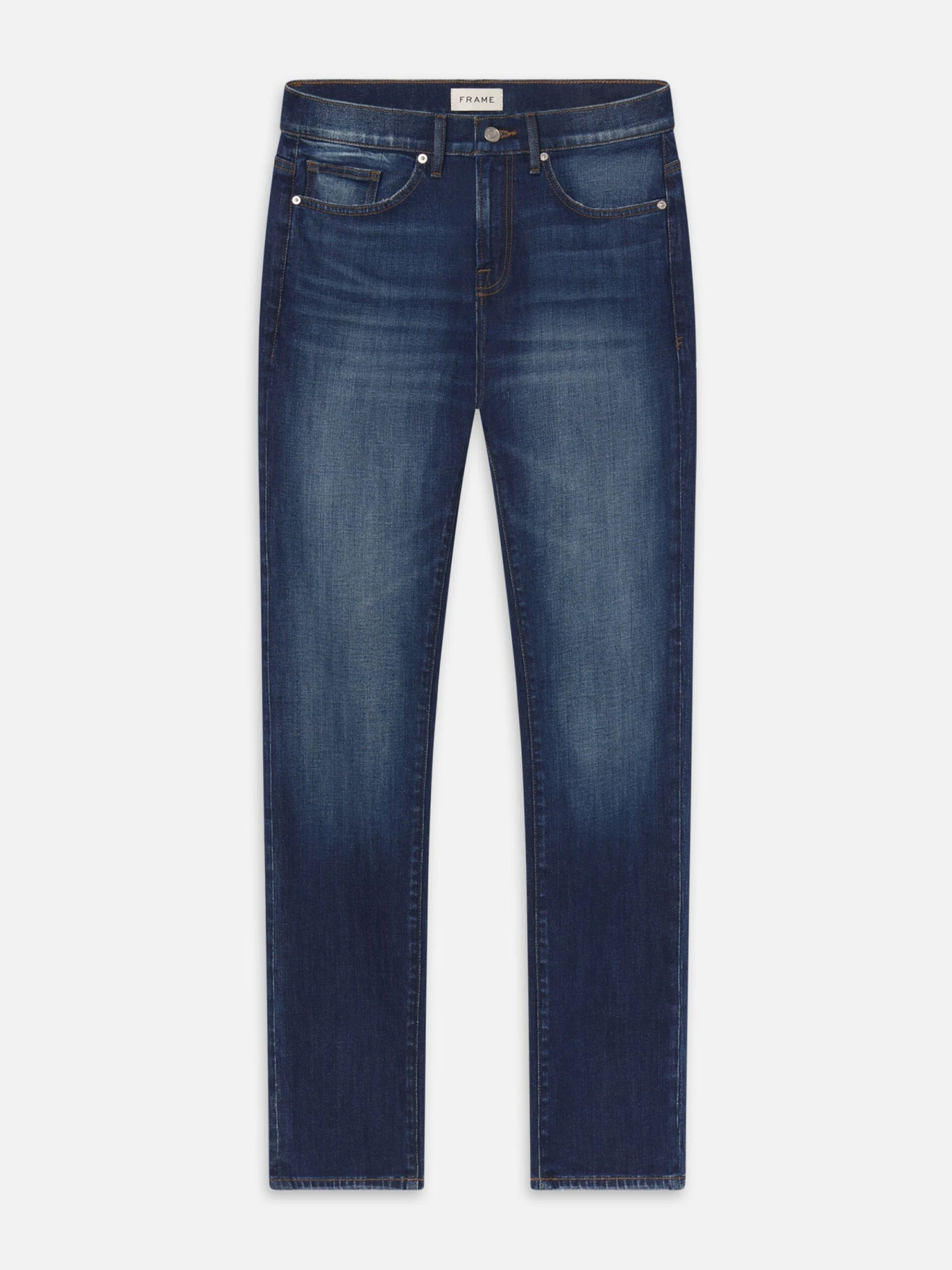 A FRAME signature jean, this style is designed with a classic 5-pocket construction, comfortable mid rise, flattering straight leg, and tapered slim fit at the leg opening. Crafted from smooth Structured Stretch denim.