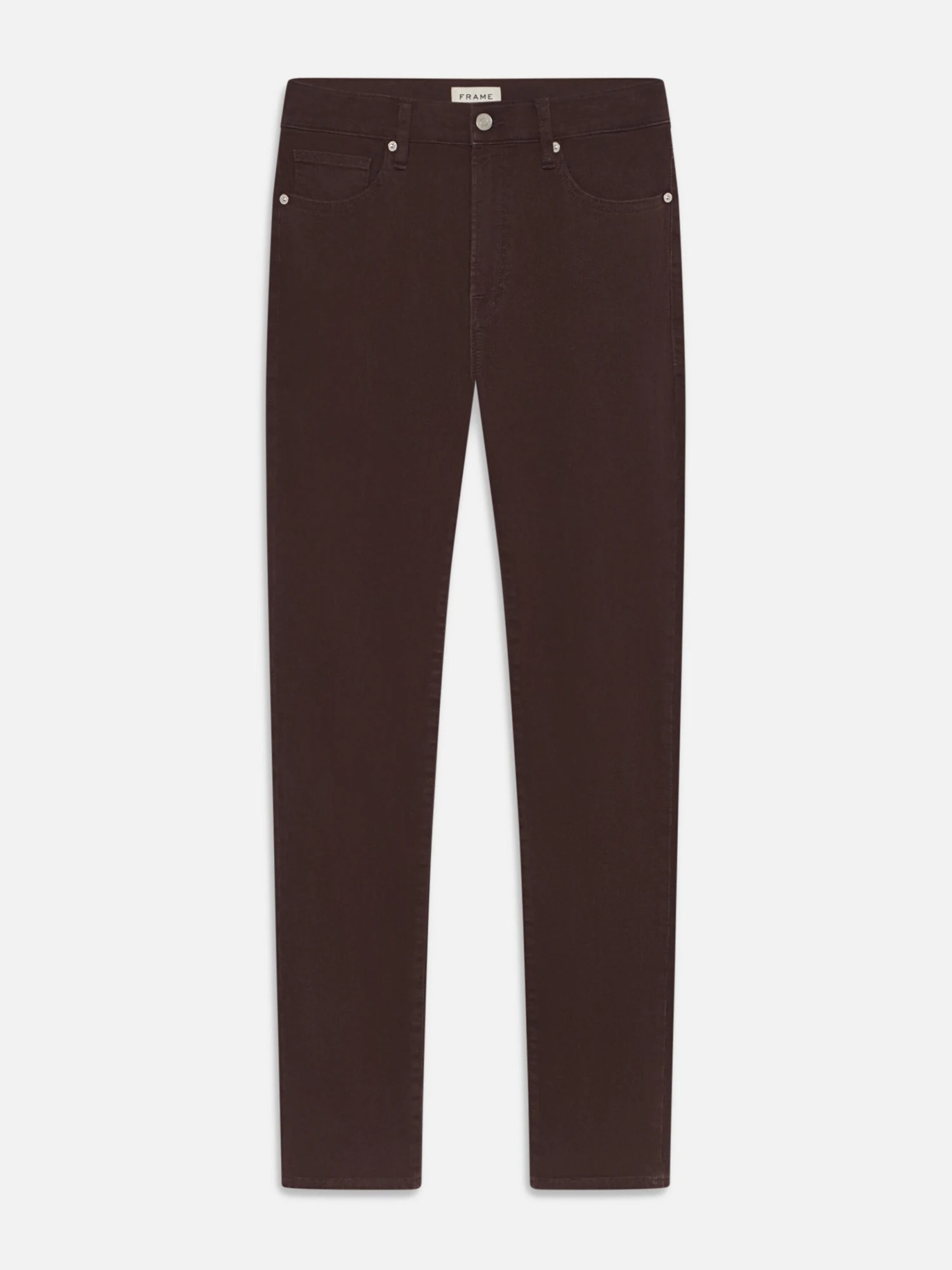 A FRAME signature jean, this style is designed with a classic 5-pocket construction, comfortable mid rise, flattering straight leg, and tapered slim fit at the leg opening. Crafted from smooth Structured Stretch denim in a dark brown wash.