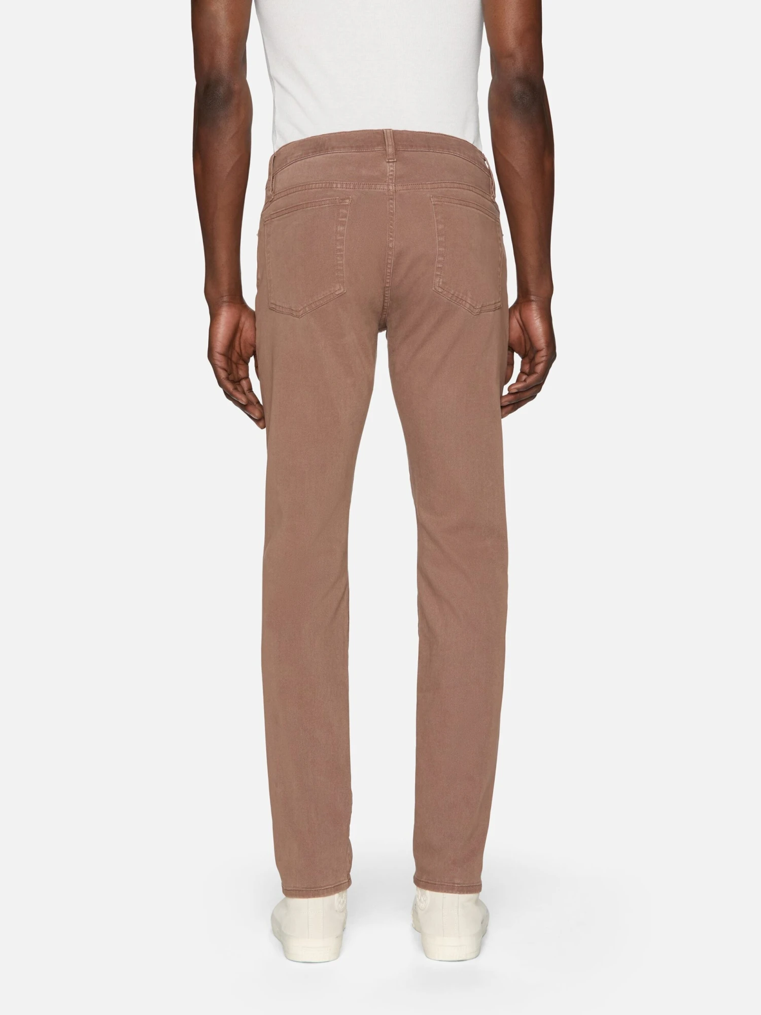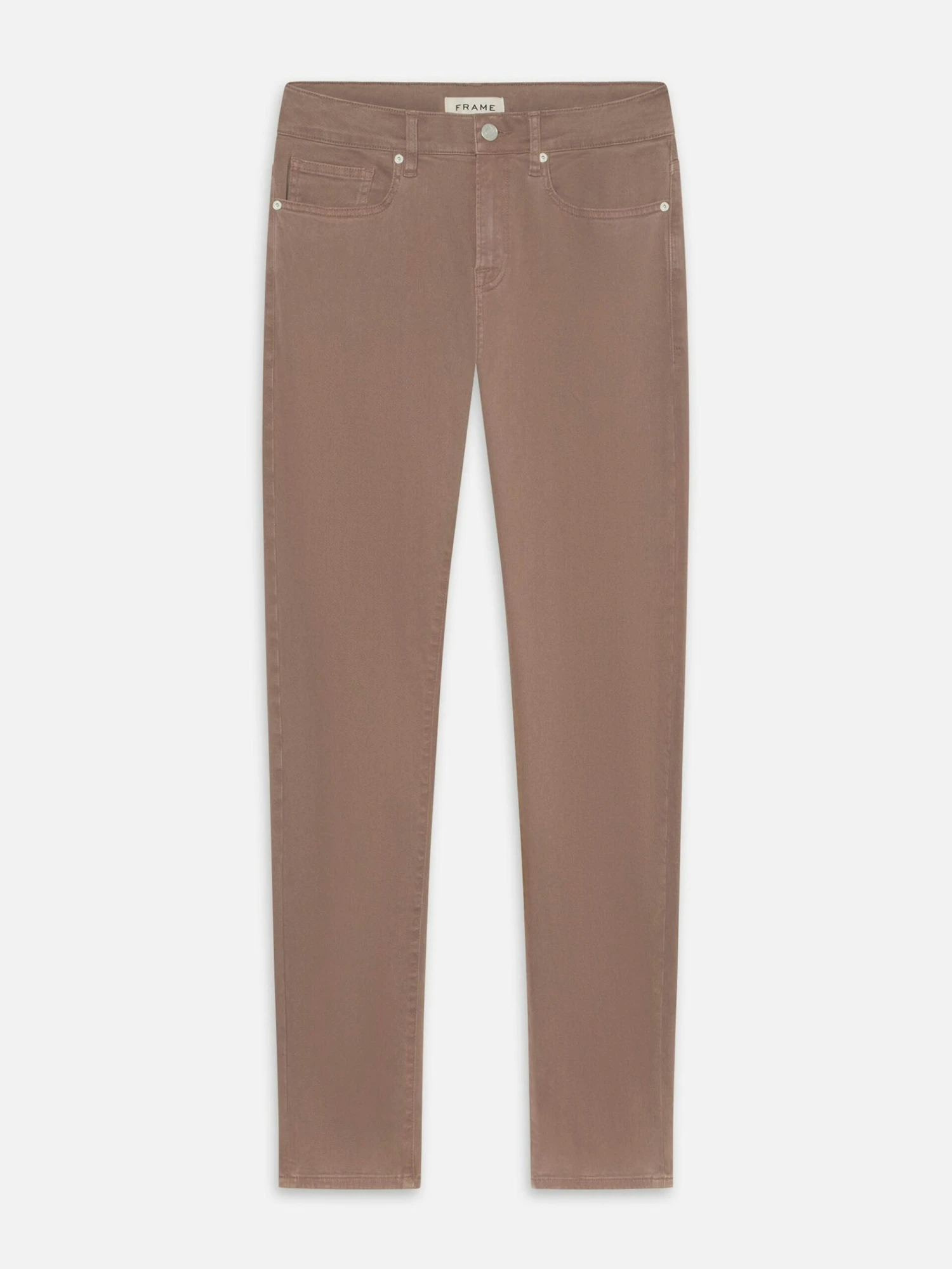 A FRAME signature jean, this style is designed with a classic 5-pocket construction, comfortable mid rise, flattering straight leg, and tapered slim fit at the leg opening. Crafted from smooth Structured Stretch denim in a mauve wash.