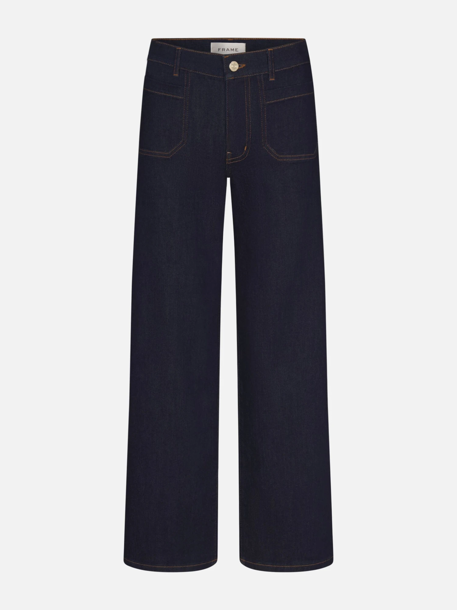 FRAME’s best-selling palazzo silhouette, now with chic front pocket details and a petite-friendly inseam. This pair has the same flattering high rise, fitted hip, and subtle wide-leg flare that hits at the floor. Crafted from a white, stretchy cotton blend for soft and comfortable wear.