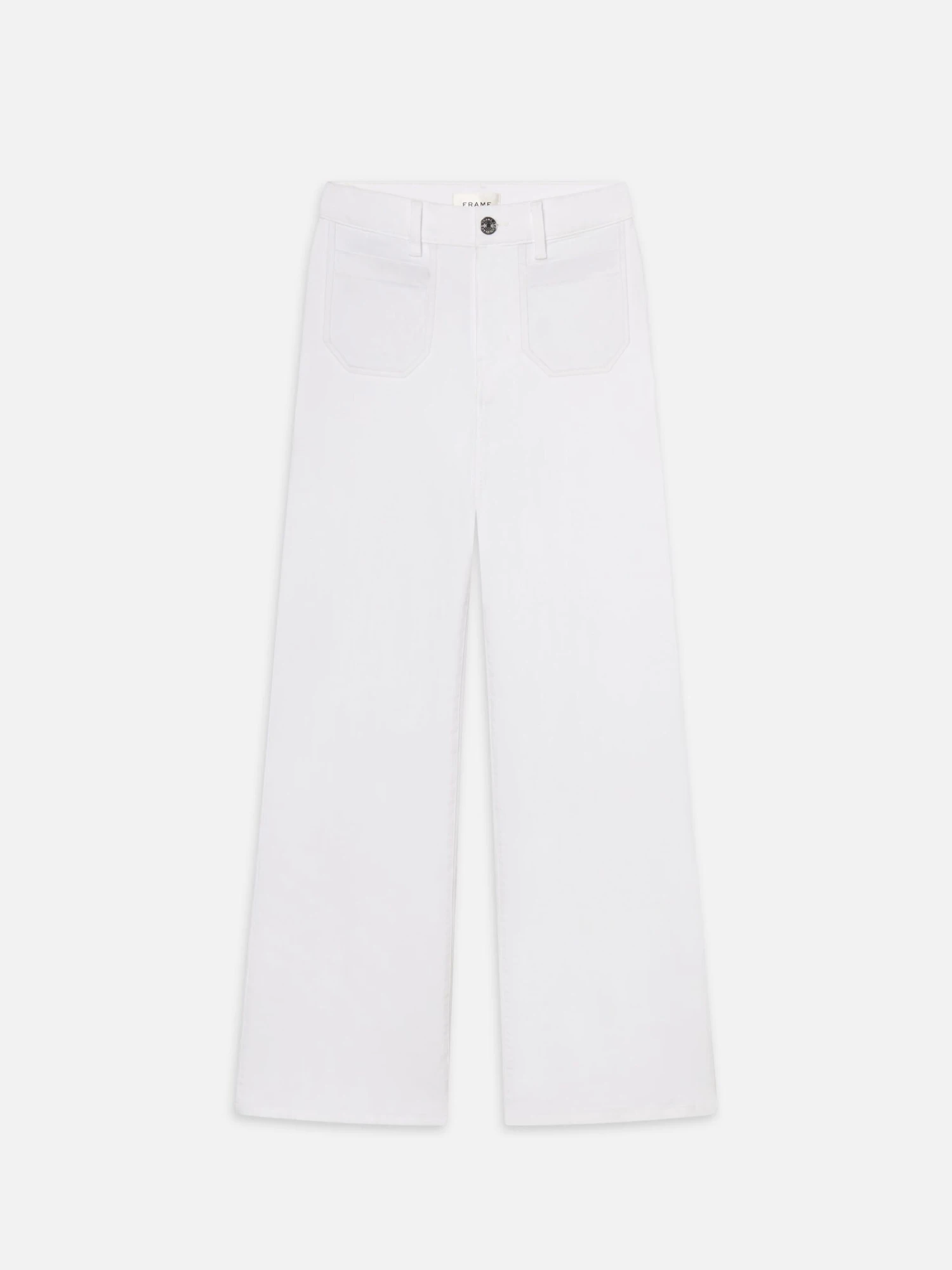 FRAME‘s best-selling palazzo silhouette, now with chic front pocket details and a petite-friendly inseam. This pair has the same flattering high rise, fitted hip, and subtle wide-leg flare that hits at the floor. Crafted from a white, stretchy cotton blend for soft and comfortable wear.