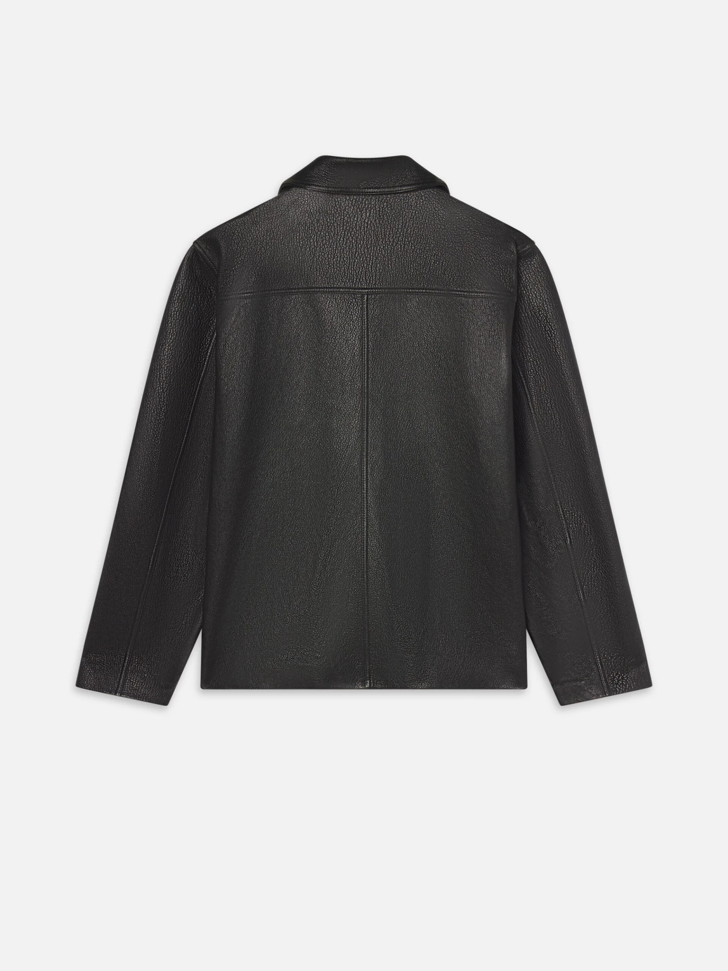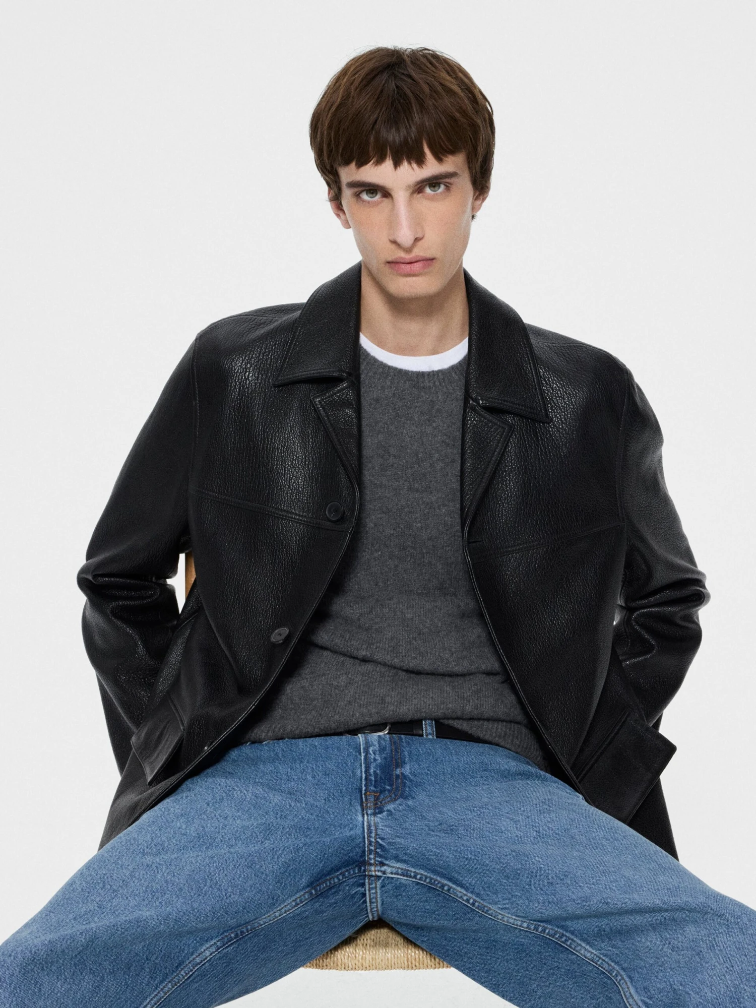 Every wardrobe deserves a timeless leather jacket. Crafted from pure lamb leather, this jacket has a line of tonal stitchwork that runs across the chest, a notched collar, and dual flap pockets at the hip. Its fluid fit teams ease with luxury, a true day-to-night piece with everlasting style.
