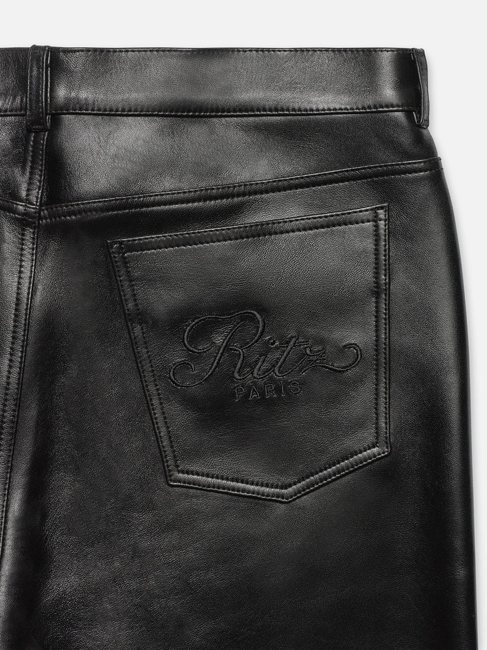 Crafted in supple 100% lamb leather—this sophisticated leather pant from FRAME x Ritz Paris is cut to a relaxed fit, comfortable mid-rise waist, classic 5-pocket detailing, and the Parisian hotelier’s signature logo in tonal embroidery at the back pocket.