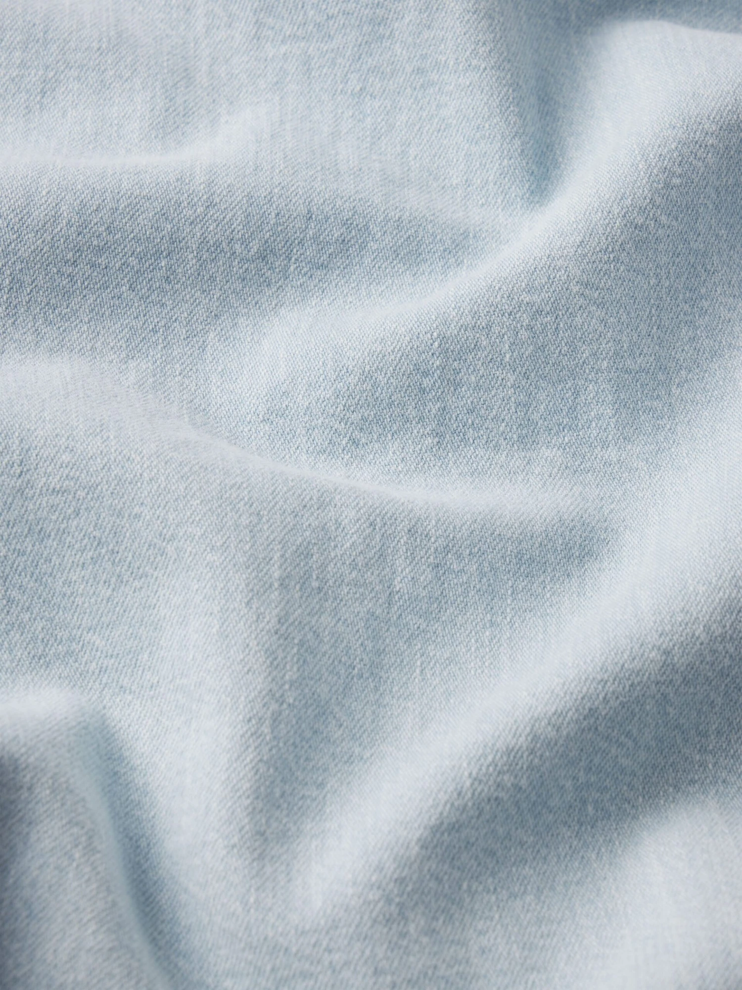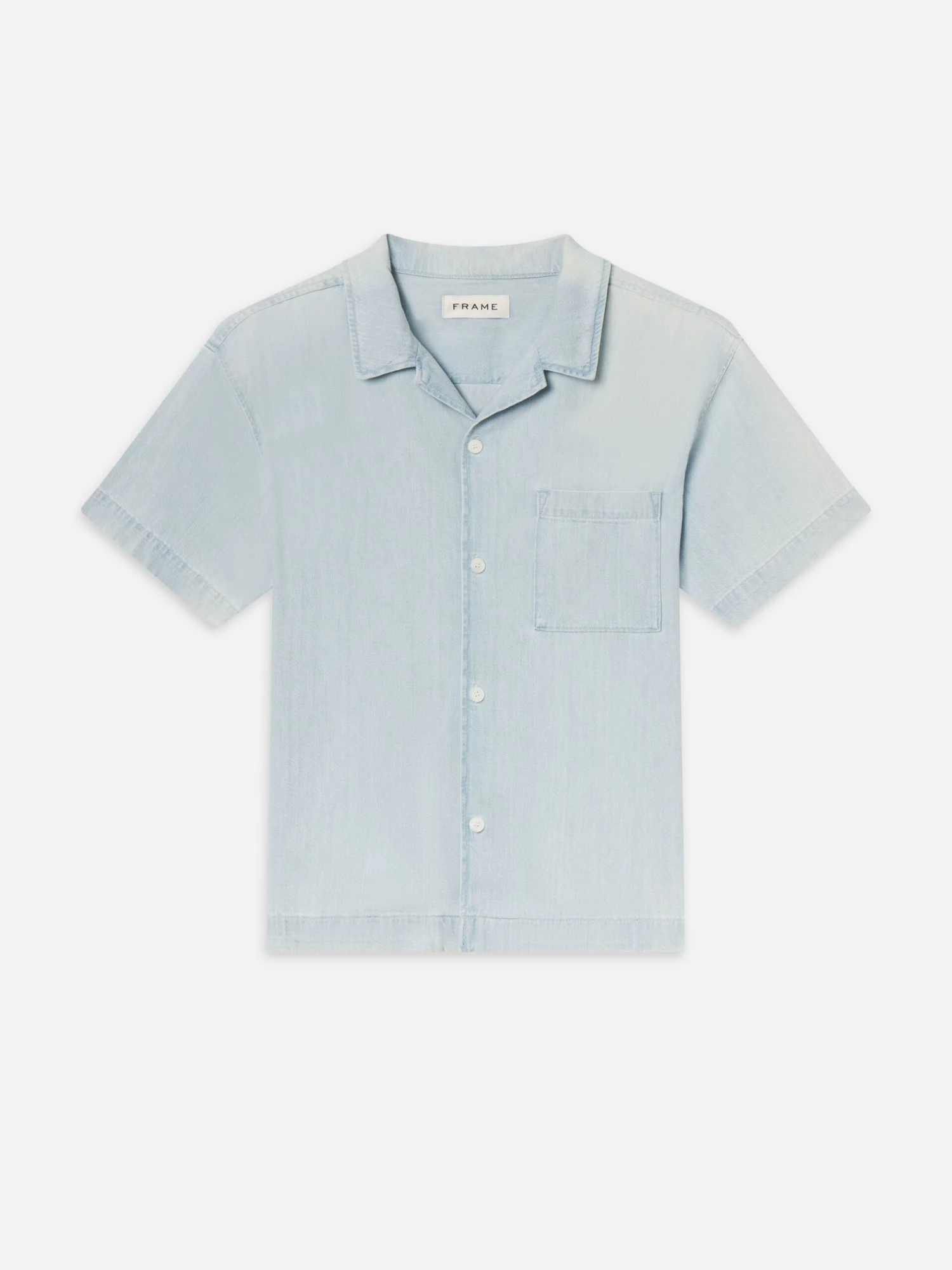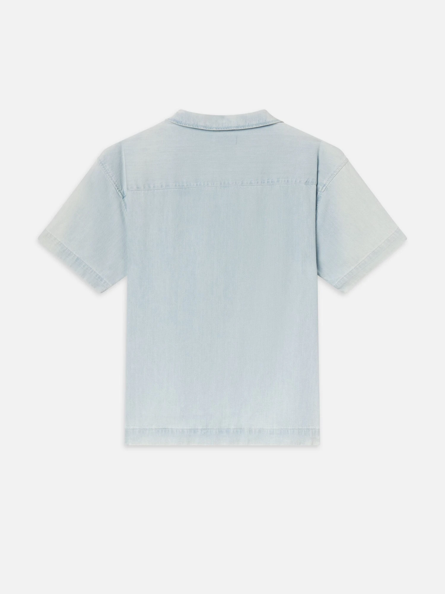 Cut with a relaxed fit and an open camp collar that sits flat for an easy, laid-back look. This short-sleeved shirt is made from pure cotton and finished with a chest patch pocket and a washed light blue hue that feels like summer.