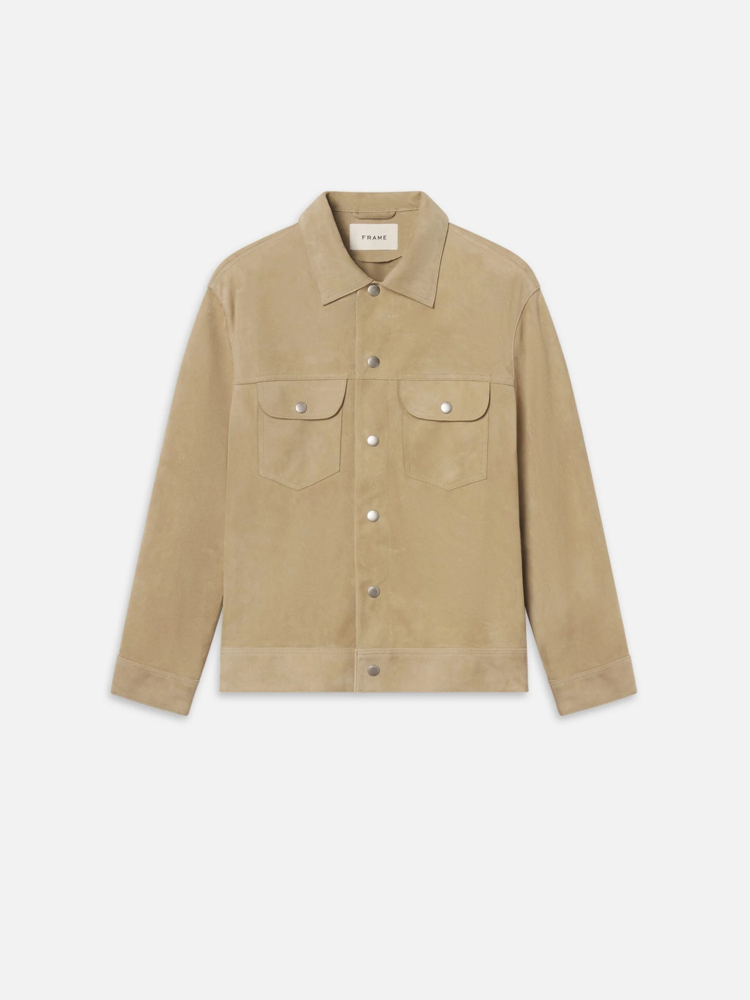 A workwear staple, upgraded in supple suede. This trucker jacket balances utility with quiet luxury, detailed by flap pockets and silver snap hardware for a timeless, tailored edge.