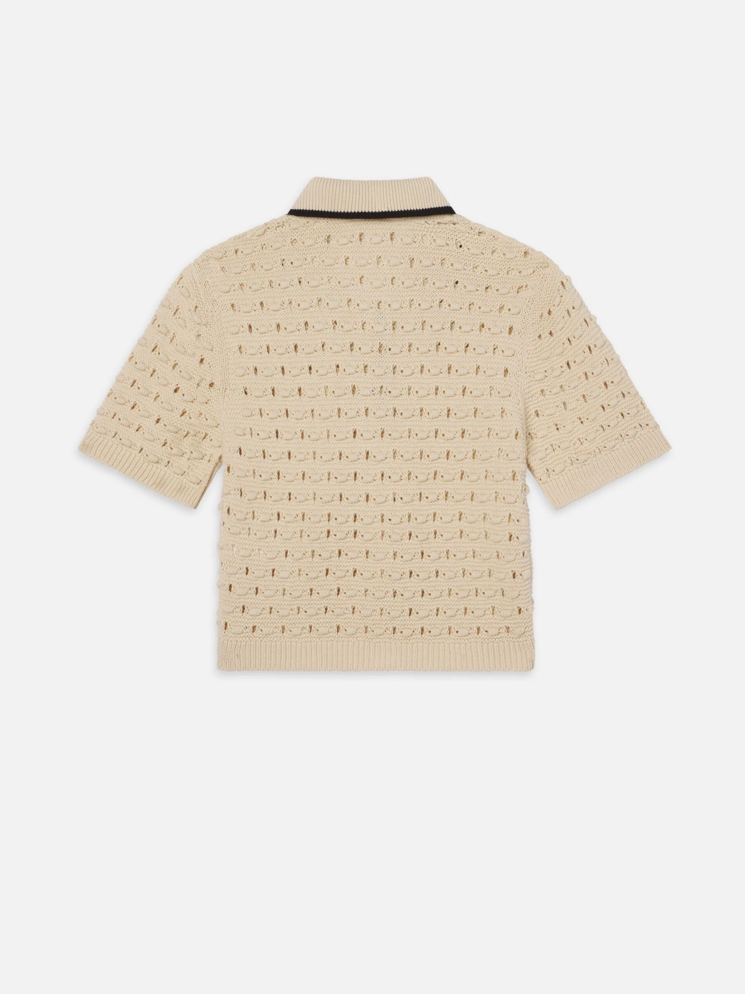 Our signature Bauble texture—lightweight, airy, and dimensional—features pointelle openwork made for warm days. Finished with a black-trimmed collar and gold summarys, this cream polo pairs with the Bauble Skirt for the knit set of summer.