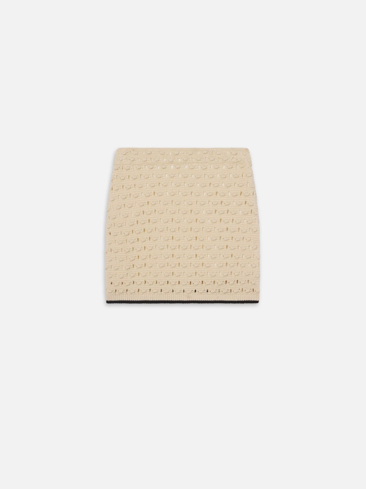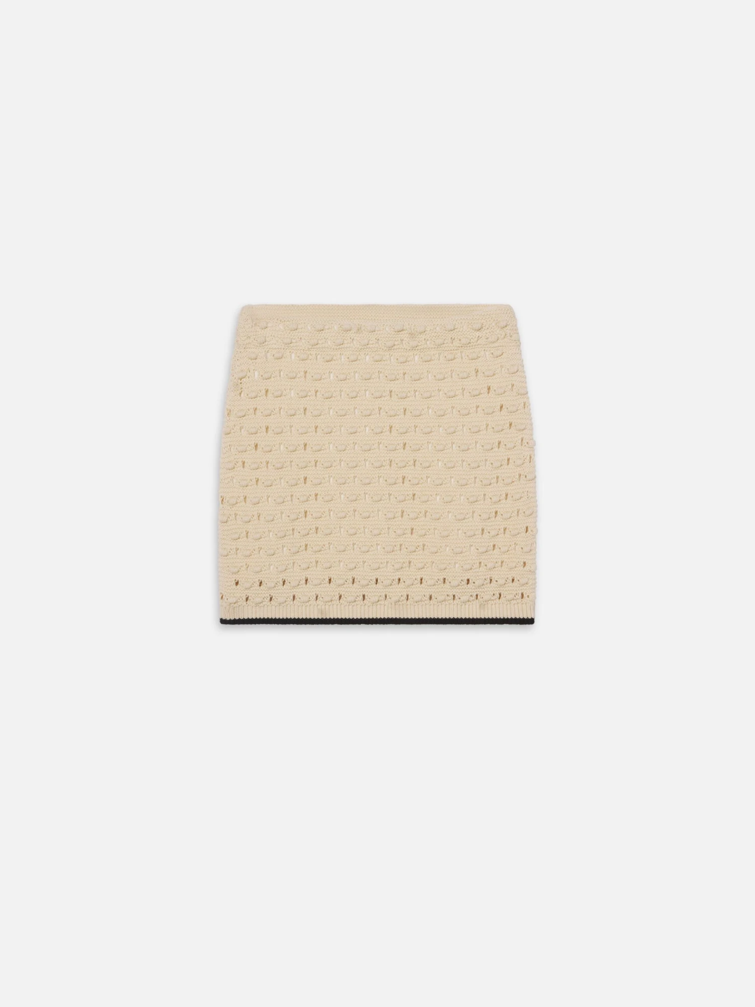 Our signature Bauble texture—lightweight, airy, and dimensional—features pointelle openwork made for warm days. This cream pull-on mini is finished by a contrast black trim. Pair yours with The Bauble Polo or Tank for the knit set of summer.