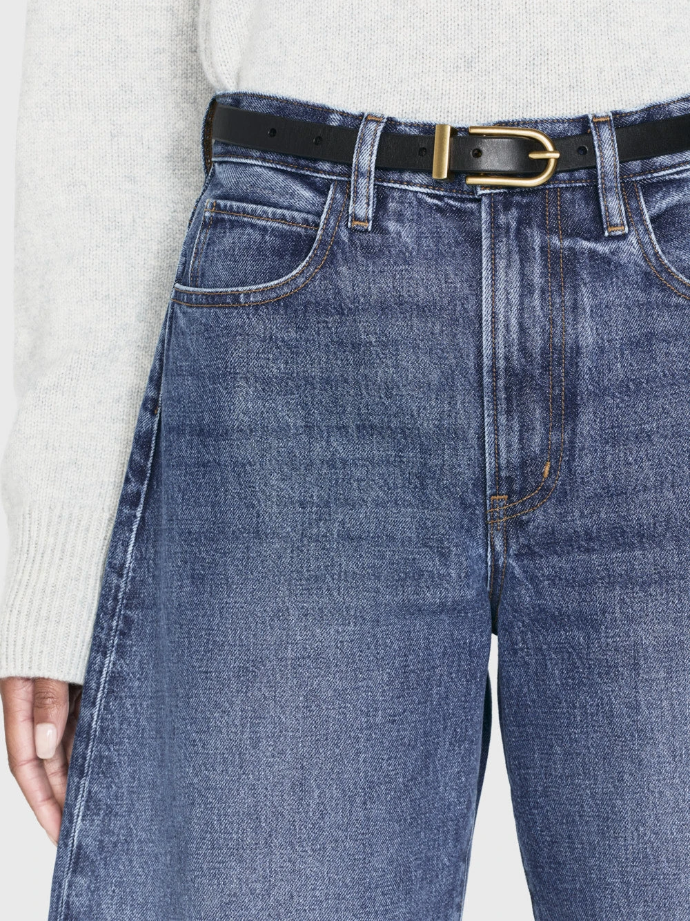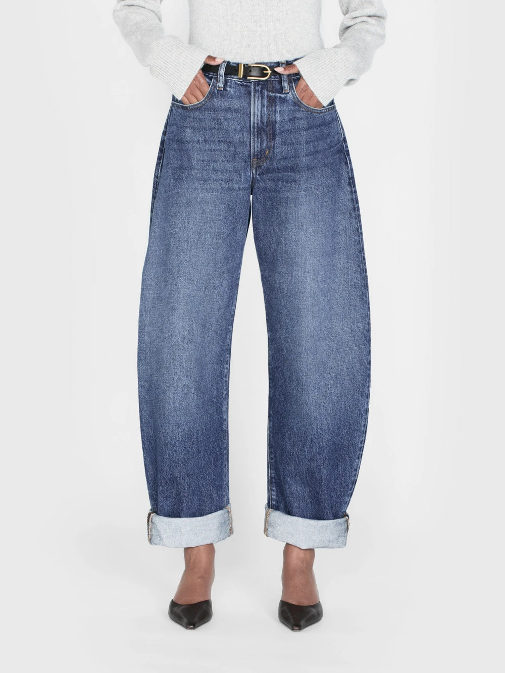 An exaggerated take on the trending barrel silhouette, this unique fit is your new closet necessity. With a flattering high rise, these jeans feature a curved outseam for a playful bubble effect. Designed to be worn cuffed and hit at the ankle, the 2.5″ twice-rolled cuff can be unrolled for a longer, more dramatic inseam.Â