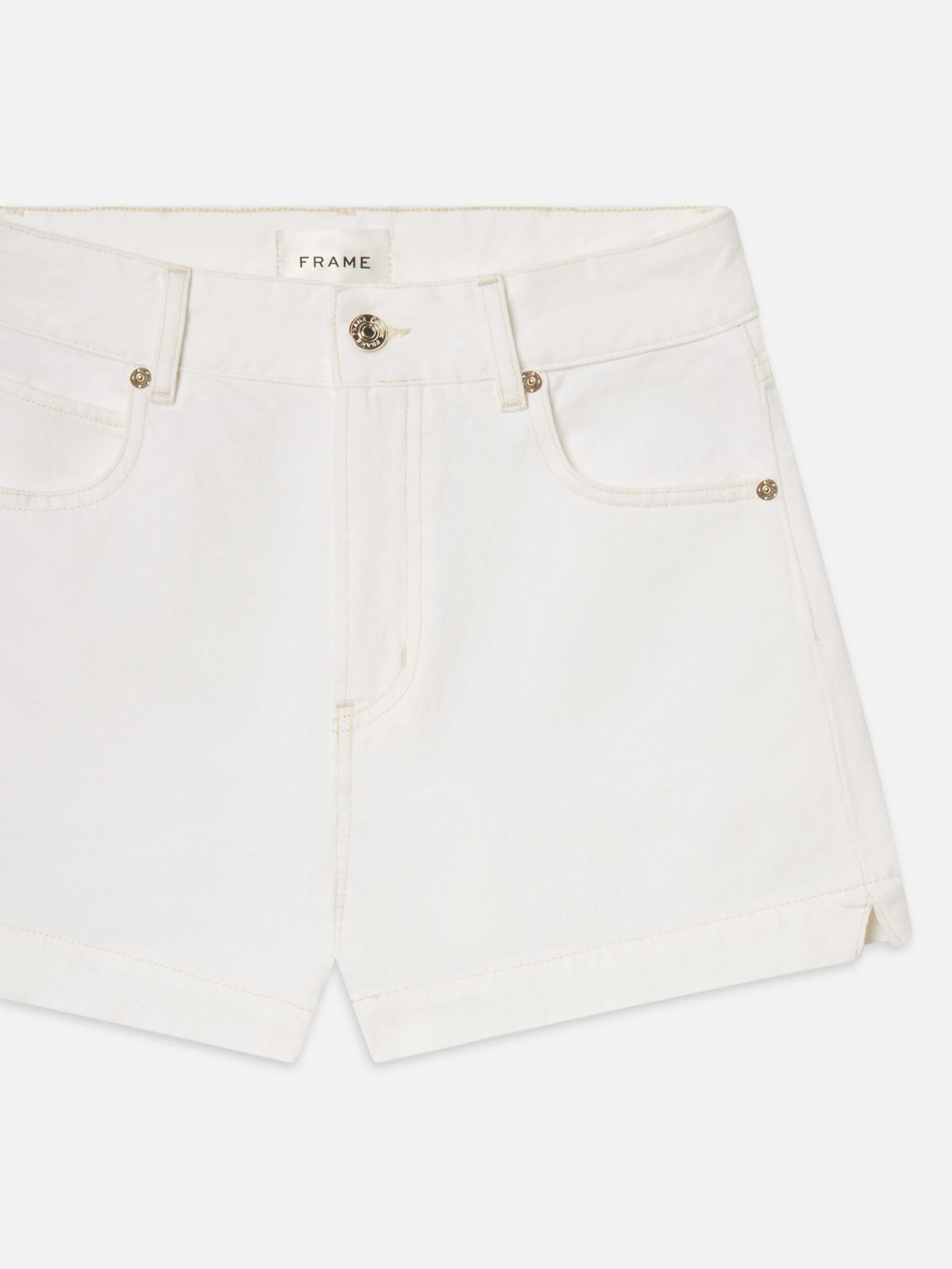 Our sweetest short yet. The Charm Short sits high at the waist with a mini inseam, wide hem, and side slits for a touch of polish. Rendered in Au Natural Clean—a soft ecru that feels equal parts nostalgic and fresh. Finished with a zip fly in rigid denim that keeps its shape.