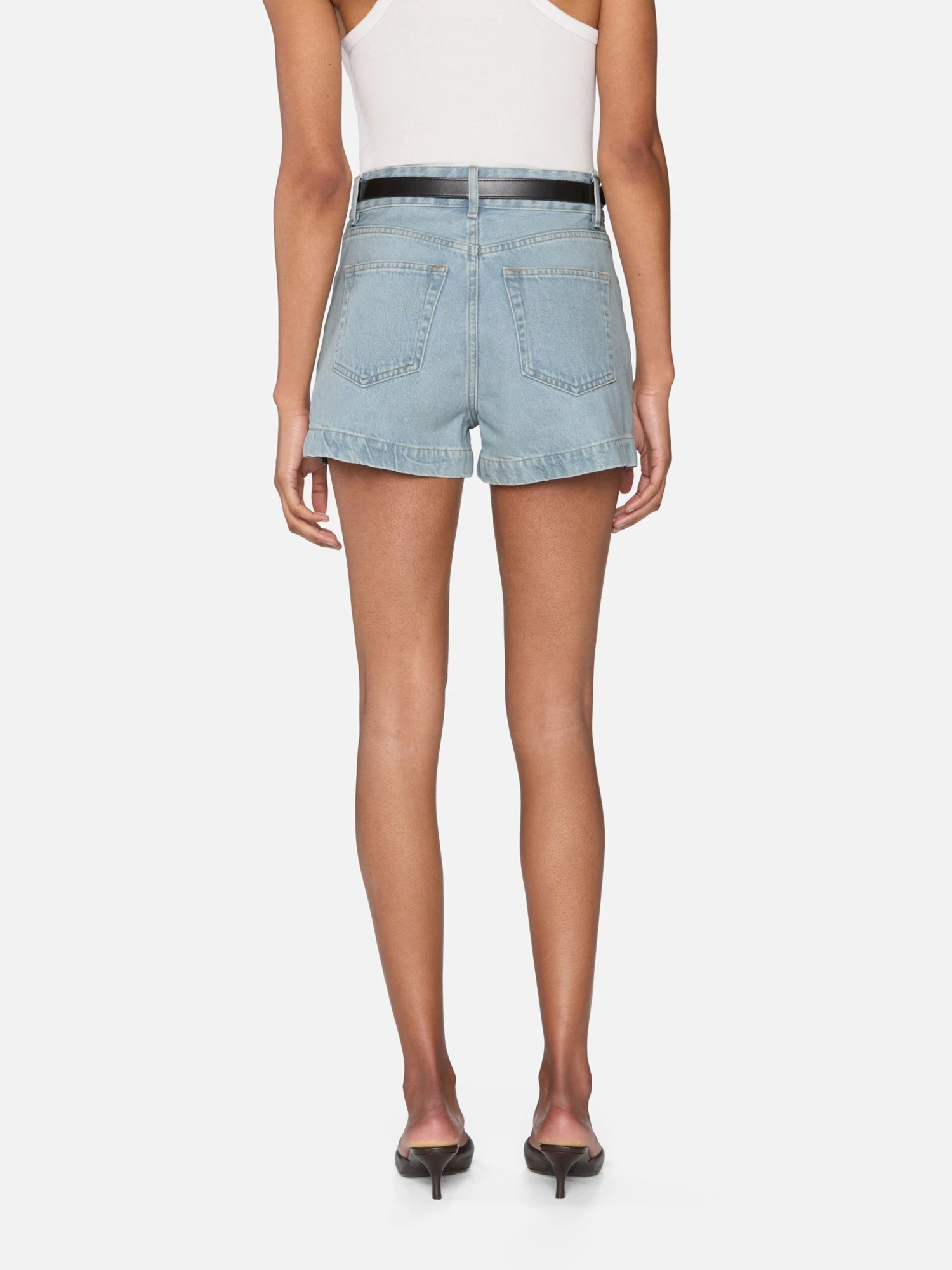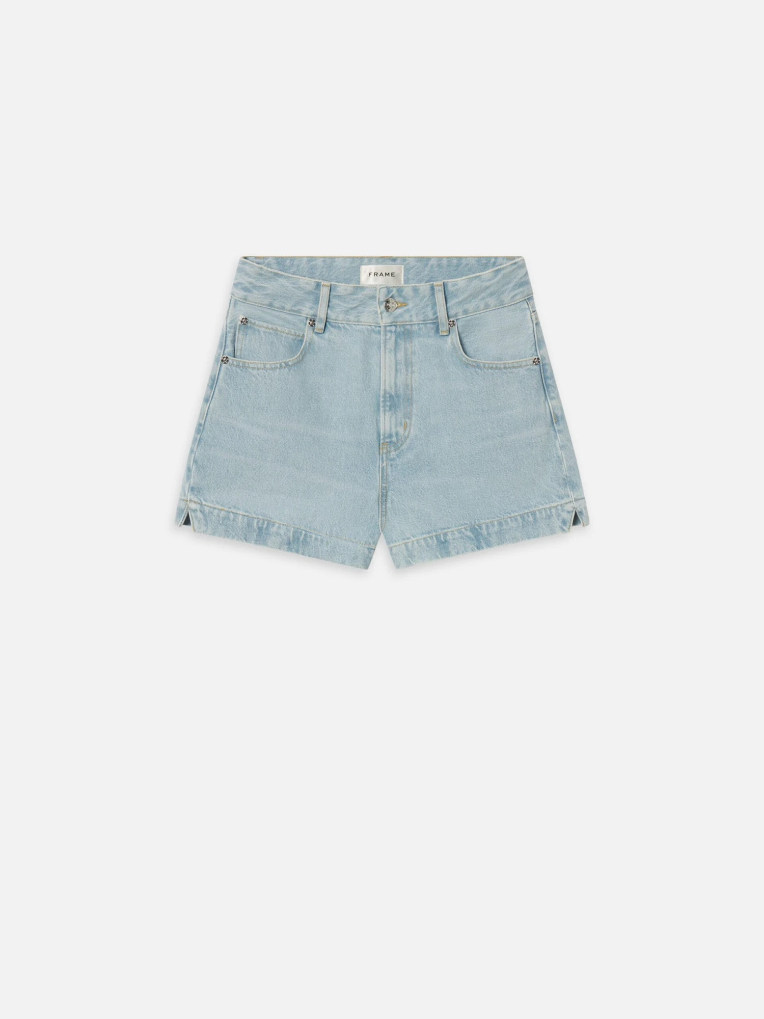 Our sweetest short yet. The Charm Short sits high at the waist with a mini inseam, wide hem, and side slits for a touch of polish. Rendered in Never—a soft, baby blue wash that feels equal parts nostalgic and fresh. Finished with a zip fly in rigid denim that keeps its shape.