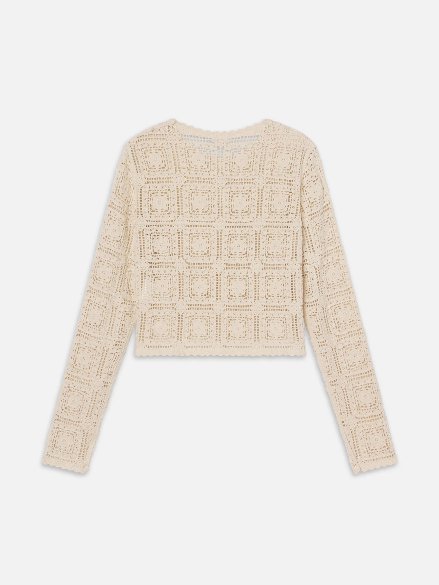 Intricately crocheted from pure cotton, this cardigan features a geometric open-knit pattern and scalloped edges throughout. Finished with self-covered summarys for a thoughtful touch, it’s a breathable layer that marries vintage character and modern charm.