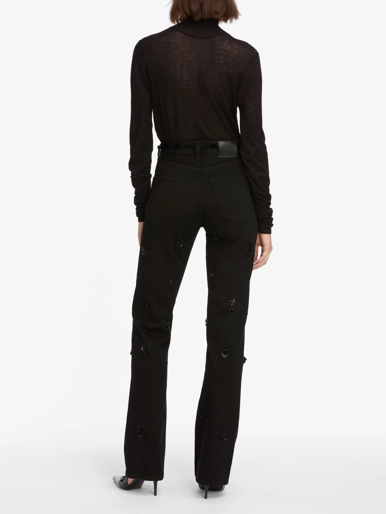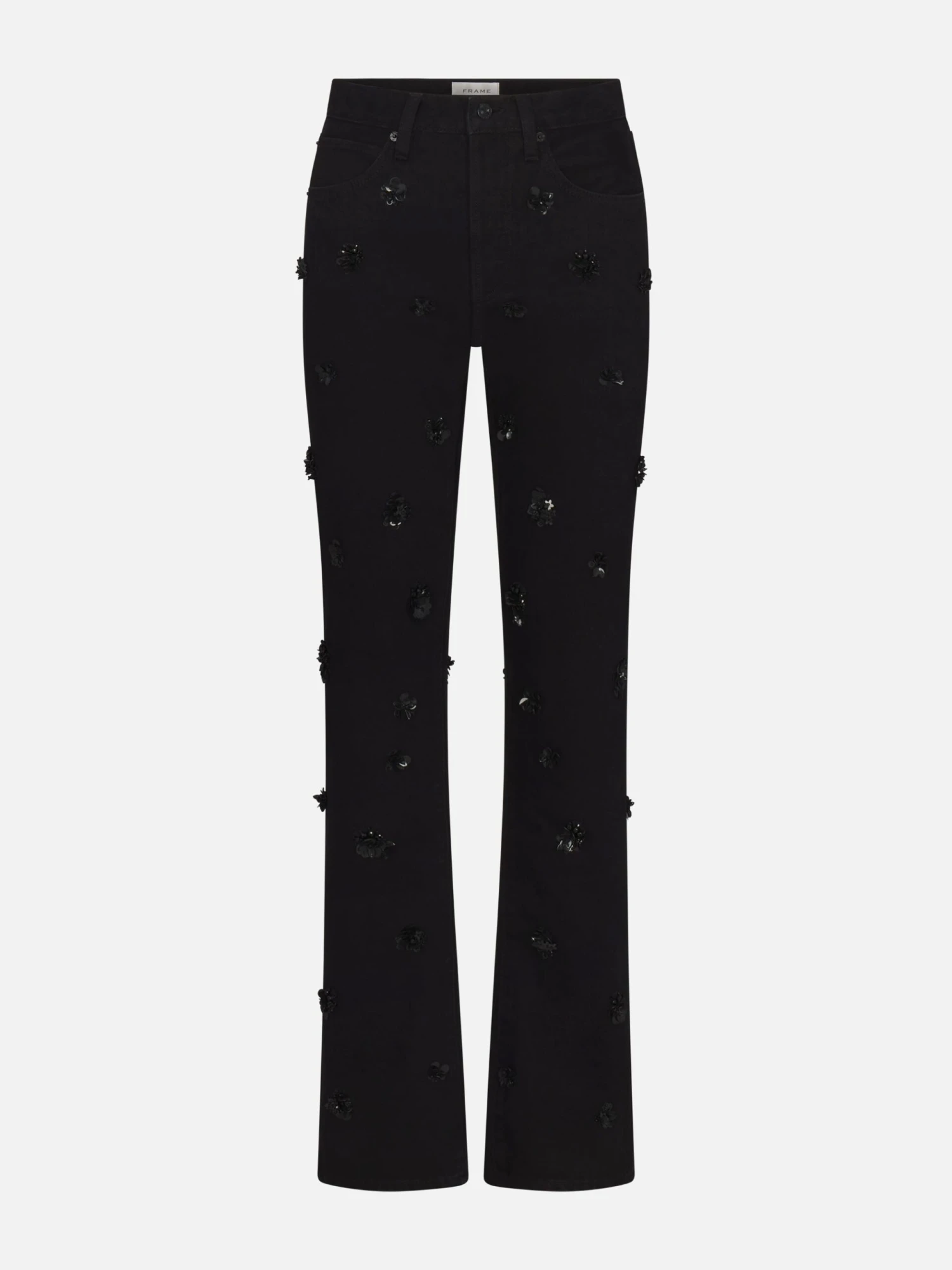This showstopping addition to your denim rotation features flower-shaped sequin appliques, hand-tacked down the leg. A sleek, straight, high-rise jean, crafted from classic non-stretch denim.
