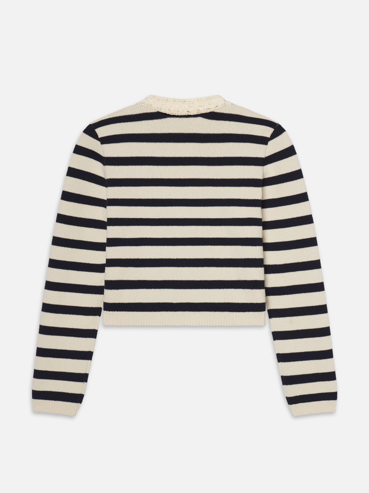 The Harbor Cardigan pairs braided trim and gold summarys with classic navy-and-cream stripes. Slightly cropped at the natural waist, this V-neck knit steers nautical in a new direction—anchored in tradition, finished with charm.