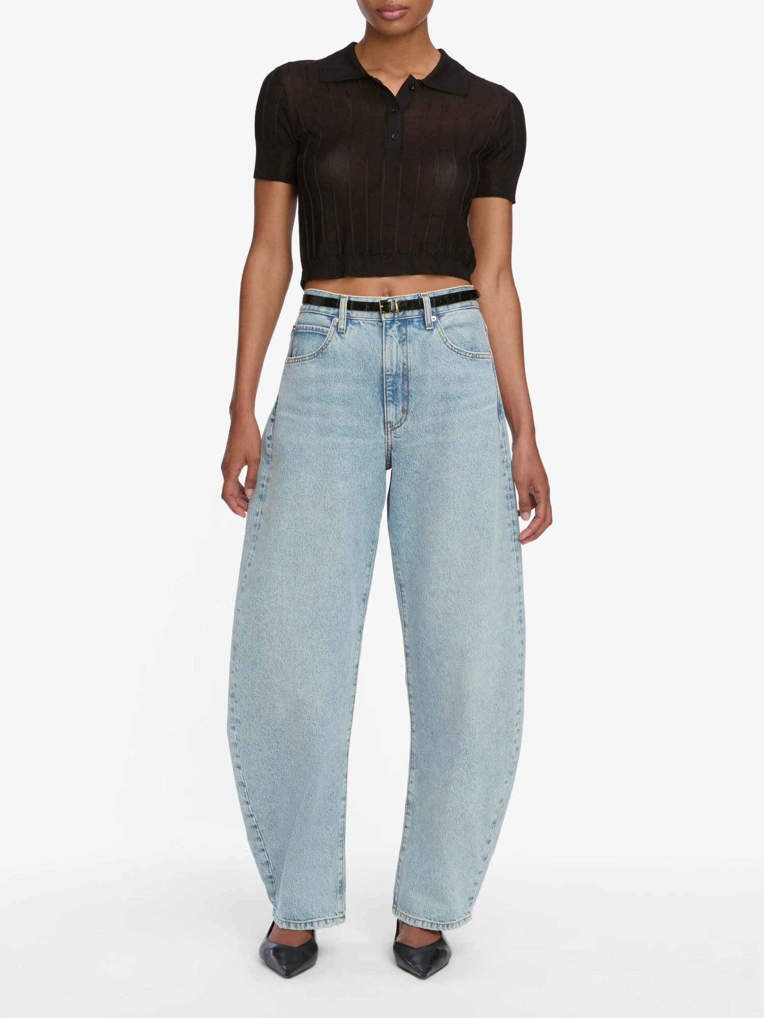 This viscose knit polo features fine vertical ribbing, a summary placket, and a modern, waistband-skimming length. Pair it with high-waisted denim for a polished, put-together look. Cut close to the body and slightly sheer, it’s easy to layer—or wear solo when the mood calls for something barely there.