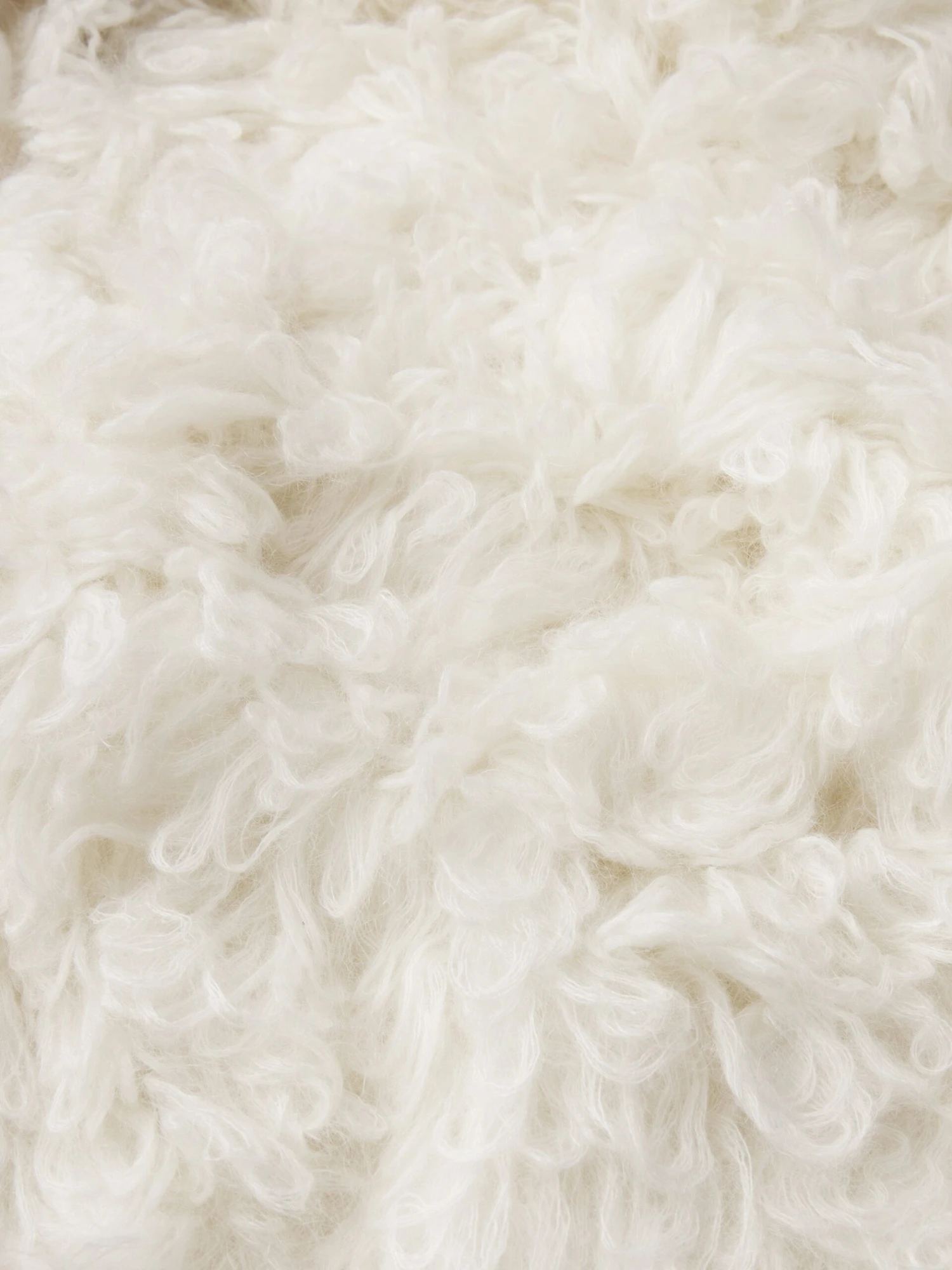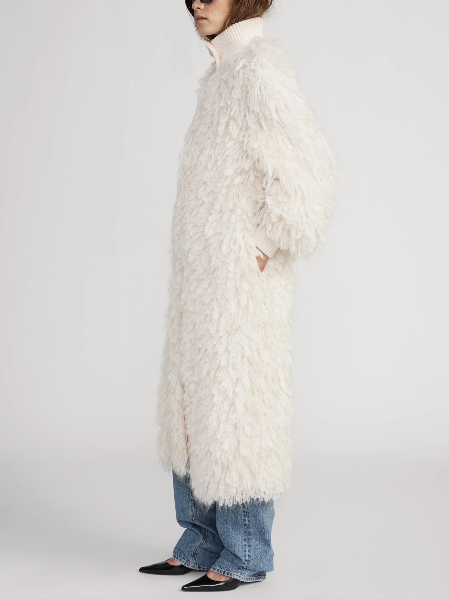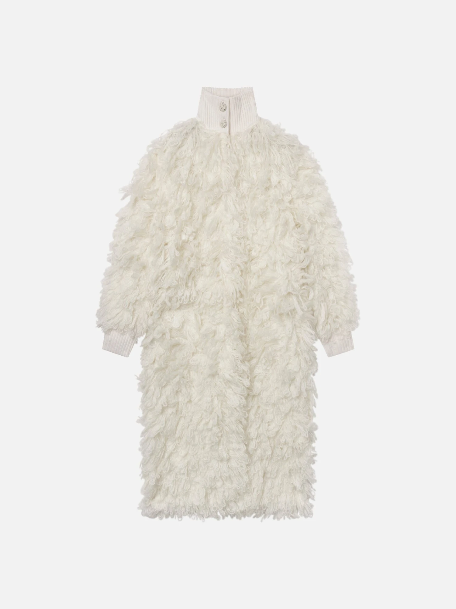 The coat of the season—plush, oversized and exquisitely crafted. Pair it with a clean simple pant for a rich textural play of drama and ease. Crafted in a knit jacquard meant to evoke shearling, with leather twisted summarys at the neck. Weighty, warm and irresistible.