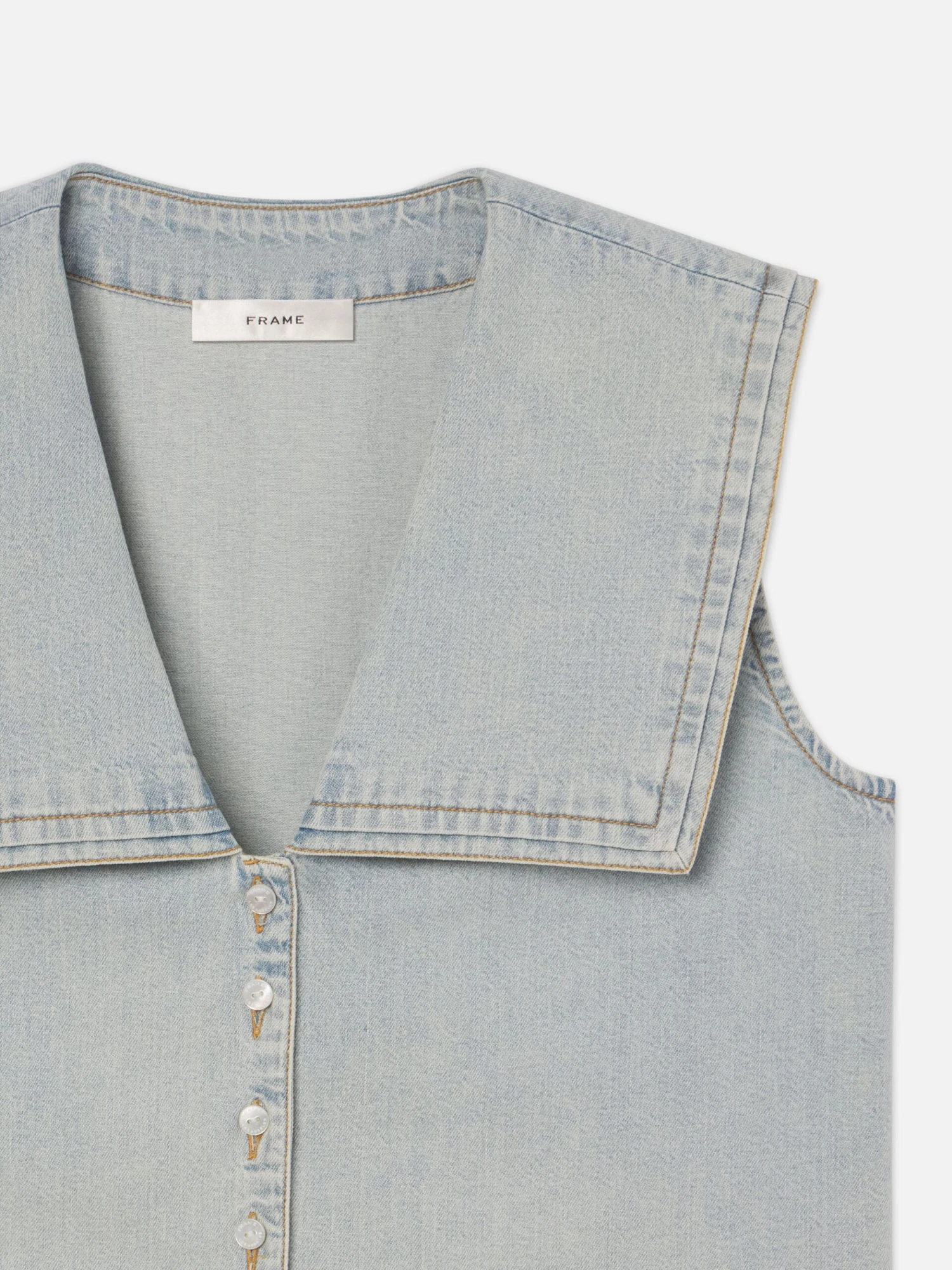 A sleeveless denim top with a wide sailor collar and a soft, sun-faded wash. Cropped to meet high-rise waistbands, it’s equal parts charming and relaxed—ready for the boat, brunch, or both.